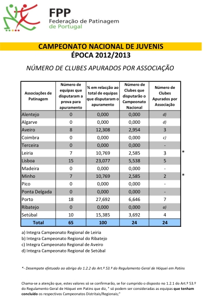 | Associações | Clubes | Equipas | Apur.C/Clube | Nº | Apur, C/Equipa | Nº | |